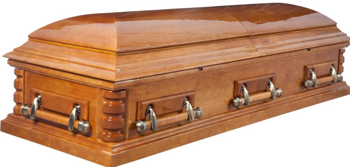 В комплект гроба входят: продольные несущие ручки из массива с металлическими наконечниками и держателями – 2 шт, петли – 4 шт, замки – 2 шт постель (верхняя (крышка) и боковая часть гроба обиты атласной тканью (с рюшей) со сборкой по всей длине (гофре), нижняя часть тканью стеганое полотно). Подушка (атлас).