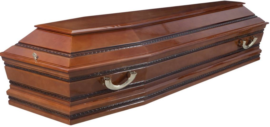Деревянный гроб выполнен в классической шестигранной форме с сужением к ногам.