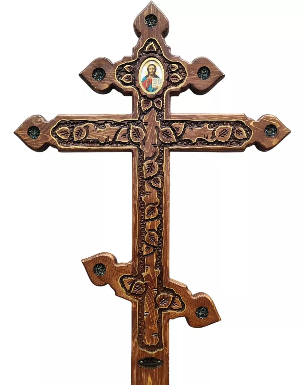 Большой православный крест из сосны с иконой. Украшен резной гравюрой. Доступен в двух вариантах — с иконой Иисус или Богородица.