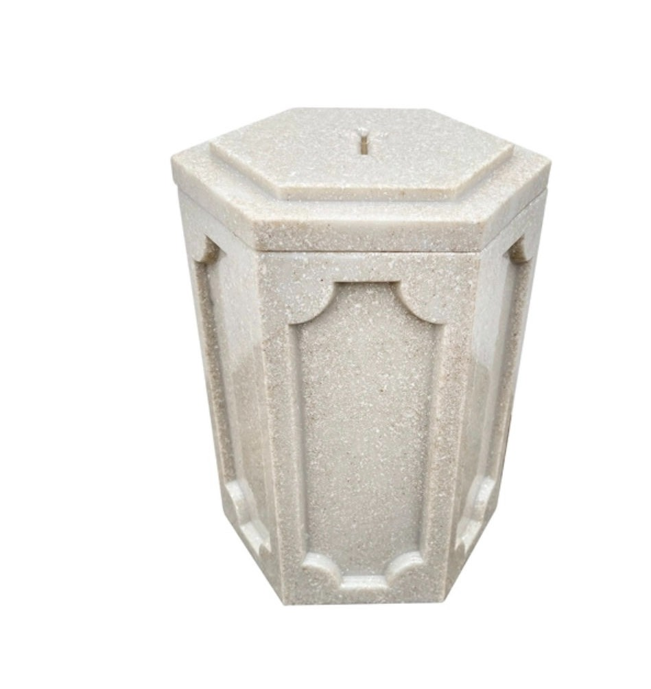 Лаконичный дизайн урны для праха и строгость полированного мрамора подчеркнуты металлическим декором. Мрамор — благородный природный камень, отличающийся разнообразием оттенков и изысканной красотой рисунка.